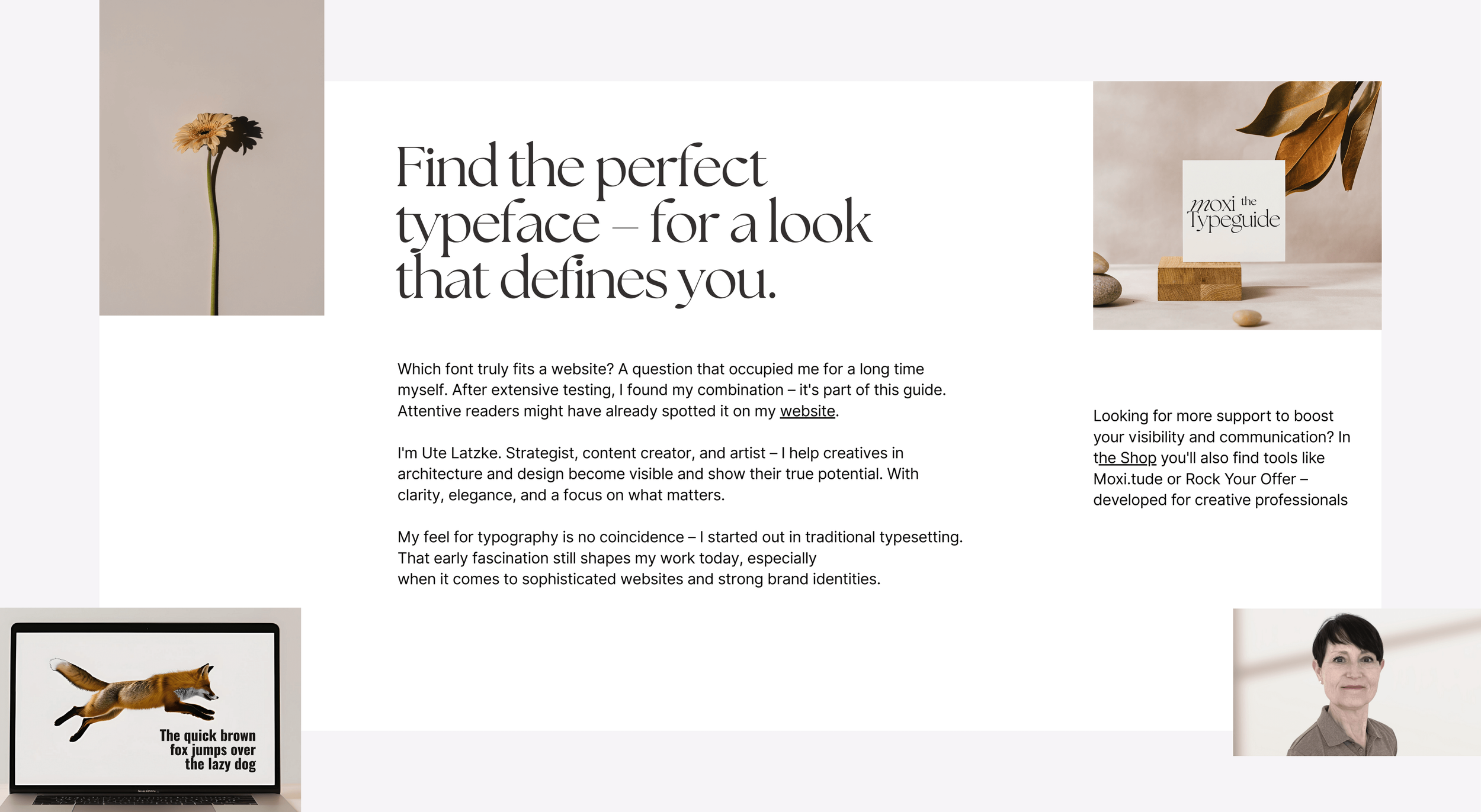 Als kreativer Professional, ArchitektIn, Fotografin etc. weißt Du, wie wichtig gute Typografie für Deinen Online- und Markenauftritt ist. Aber die Fontsauswahl ist überwältigend und erschlagend. Welche Kombination passt zu Deiner Branche, Deinem Stil, Deiner Website? Das Suchen hat ein Ende. Hier kommt der moxi.typeguide. Dort findest Du 30 kuratierte Font-Pairings für eine zeitlos elegante Website und einen konsistenen Look über alle Kommunikationskanäle: Optimiert für squarespace (auch andere Webeditoren) und canva. Das ästhetische Booklet ist ideal für alle, die eine starke visuelle Sprache für ihr Business suchen – ganz ohne stundenlanges Scrollen durch Font-Datenbanken. Inspirierende Settings als Mood-Bilder dienen als visuelle Anregung und zeigen, wie die Schriftpaarungen im Kontext wirken können.
