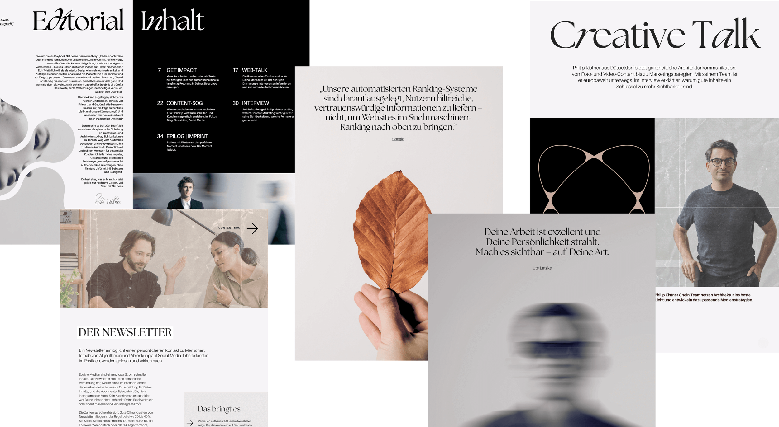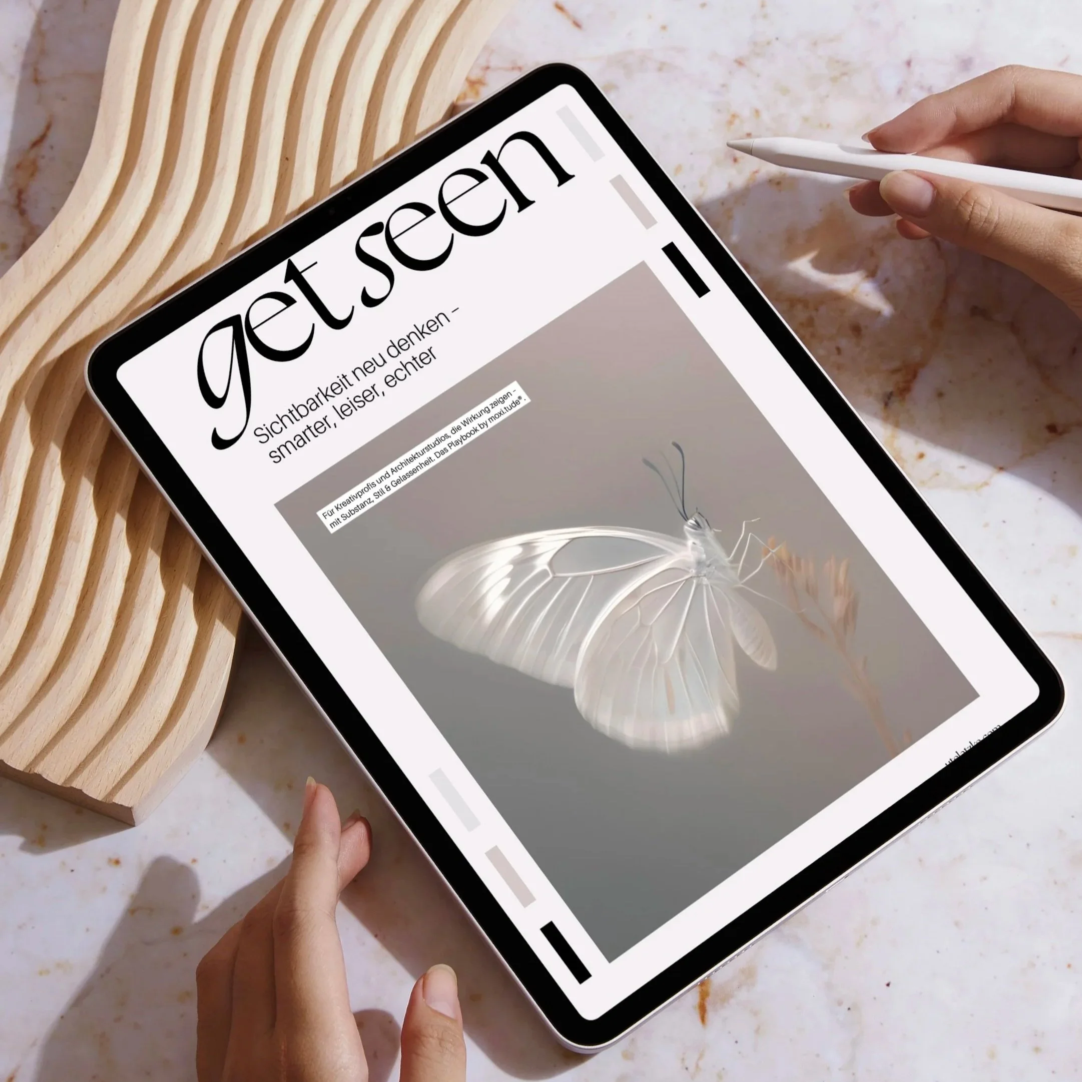 Darum habe ich „Get Seen” entwickelt – ein Playbook mit Denkanstößen für eine Sichtbarkeit, die sich richtig anfühlt. Es zeigt Dir einen Weg zu klaren Texten und Content-Ideen für Blog, Newsletter und Social Media. Get Seen ist kein üblicher Leitfaden, sondern gestaltet wie ein stilvolles Magazin – avantgardistisch, editorial, inspirierend. Für mehr Klarheit, Ruhe sowie Entschlossenheit.